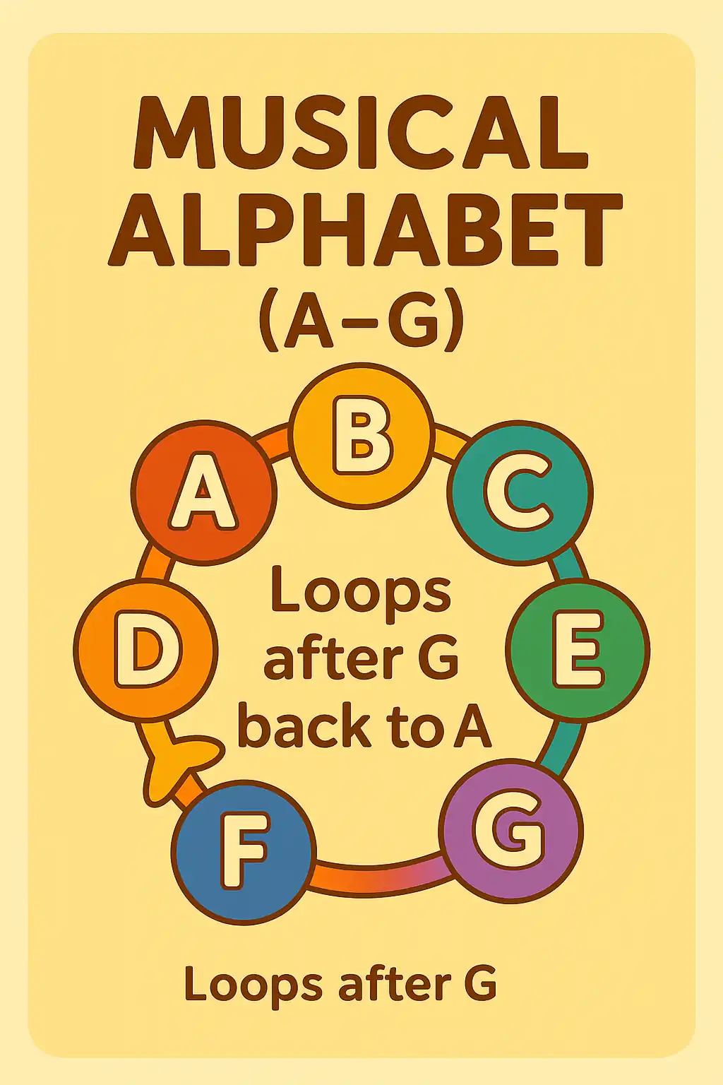 Seven-letter cycle: The musical alphabet is A–G, then it repeats. After G comes A again.