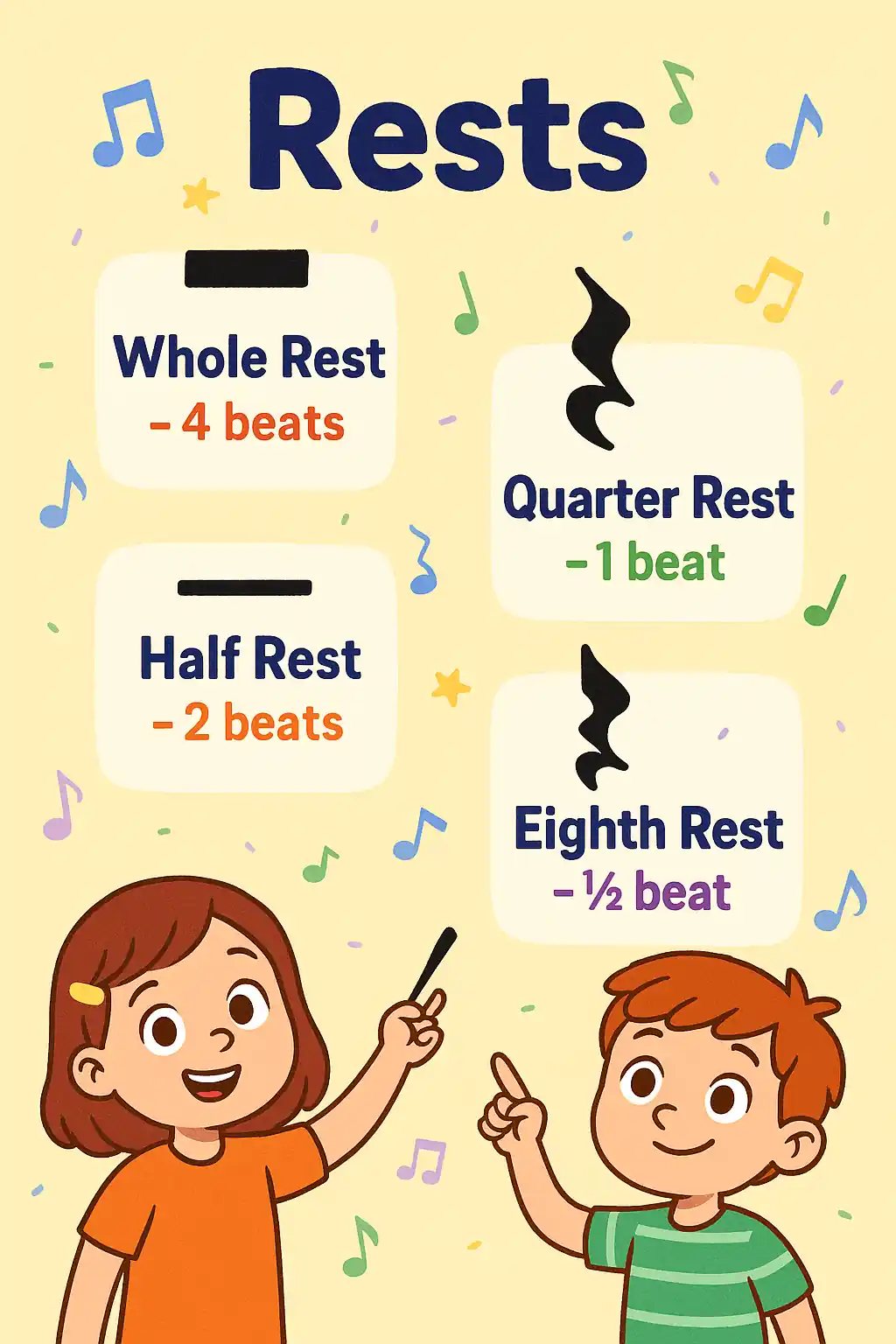 Think of rests like punctuation in reading—commas, periods, and pauses help the story flow.